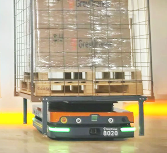 AGV (Automated Guided Vehicle) = ohjattu ajoneuvo tai automaattitrukki – liikkuu ennalta määriteltyjä reittejä pitkin esimerkiksi lattiaan upotettujen magneettinauhojen tai merkkien avulla.